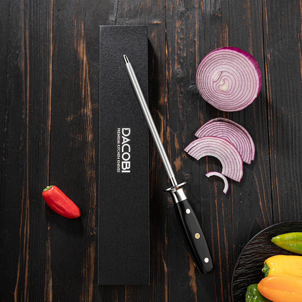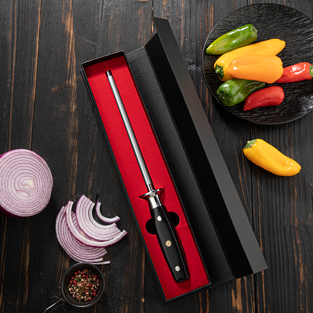 Održavajte oštricu svojih omiljenih noževa pomoću ove šipke za brušenje s ergonomskom ručkom. Izrađen od karbonskog metala, fin i precizan, ima i prsten za zaštitu ruku.