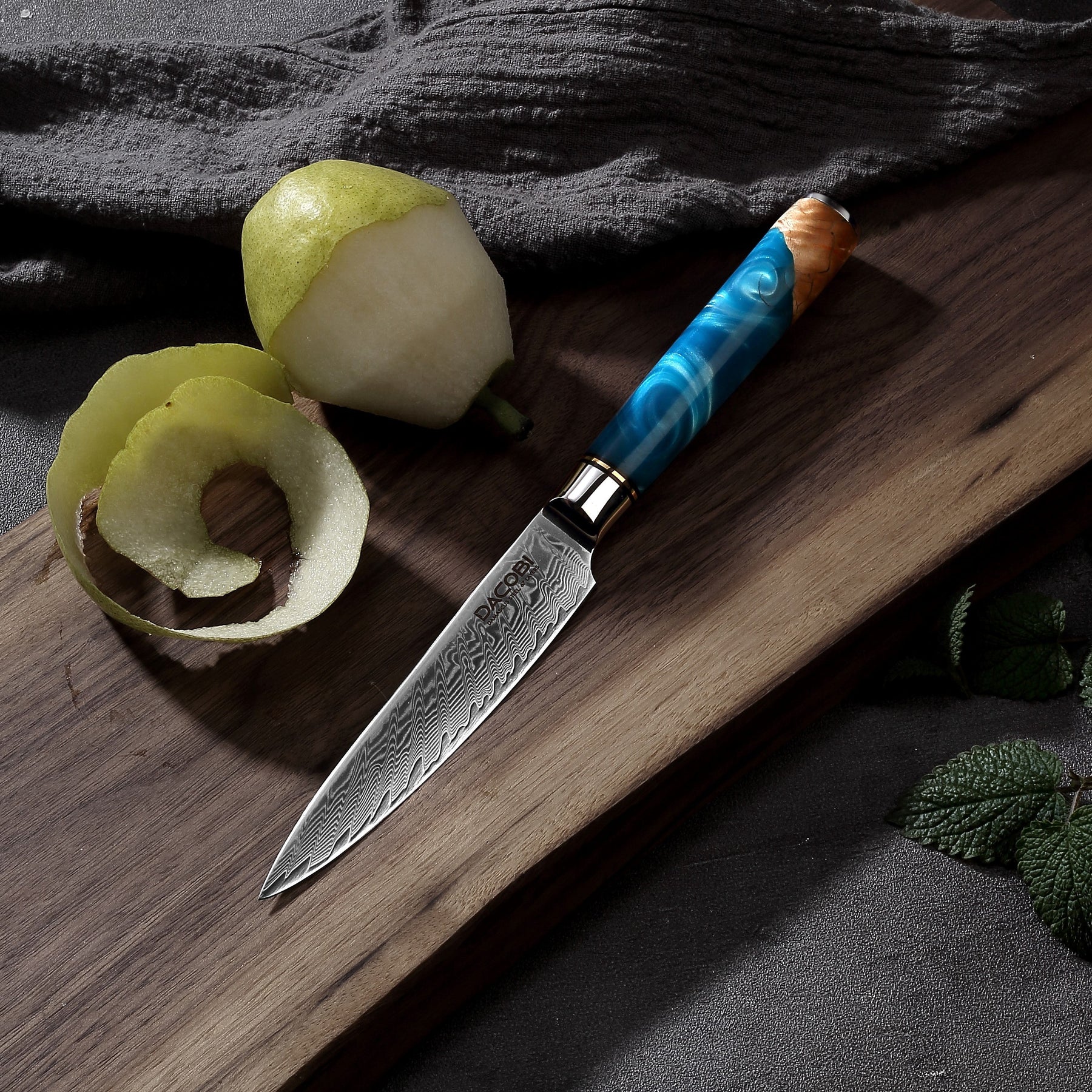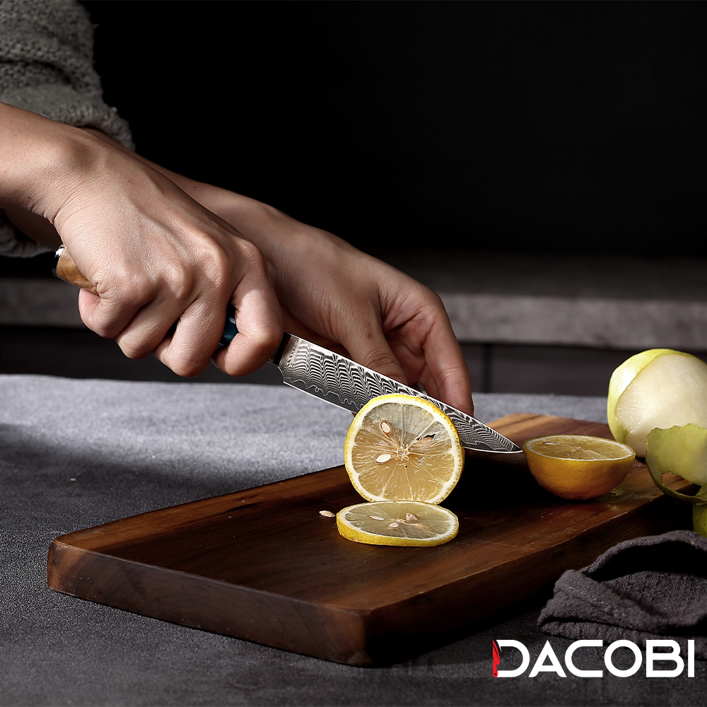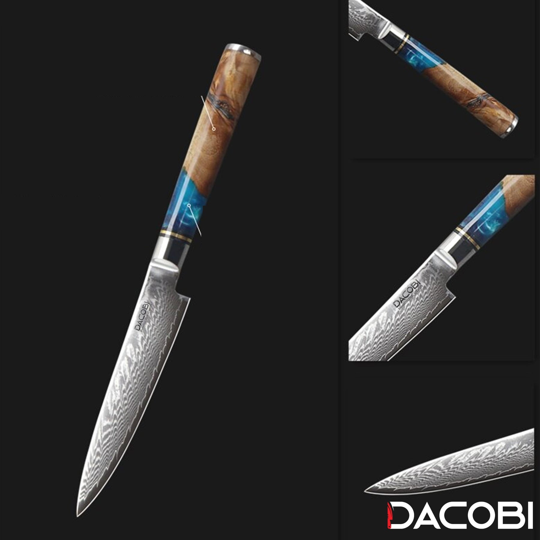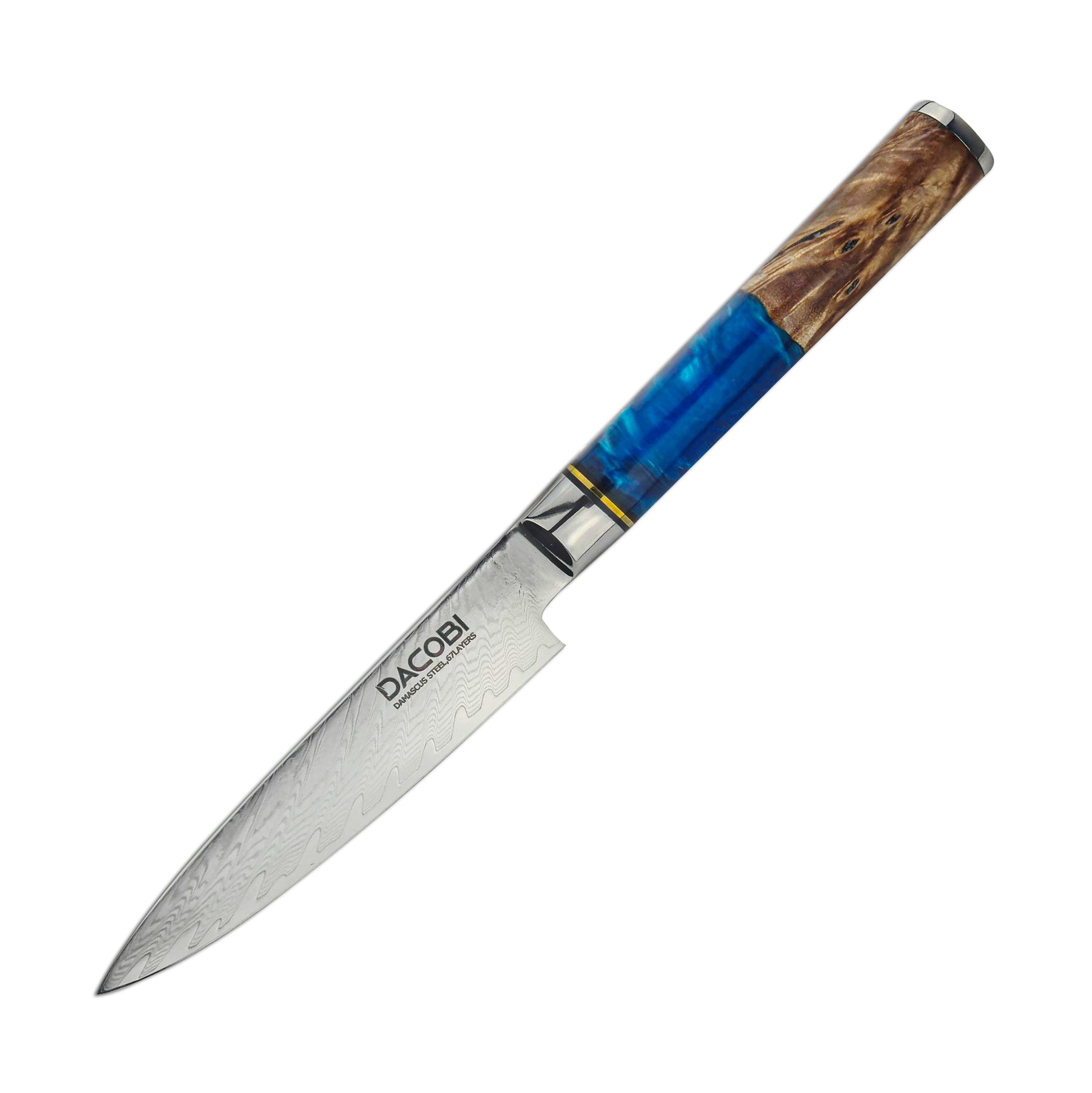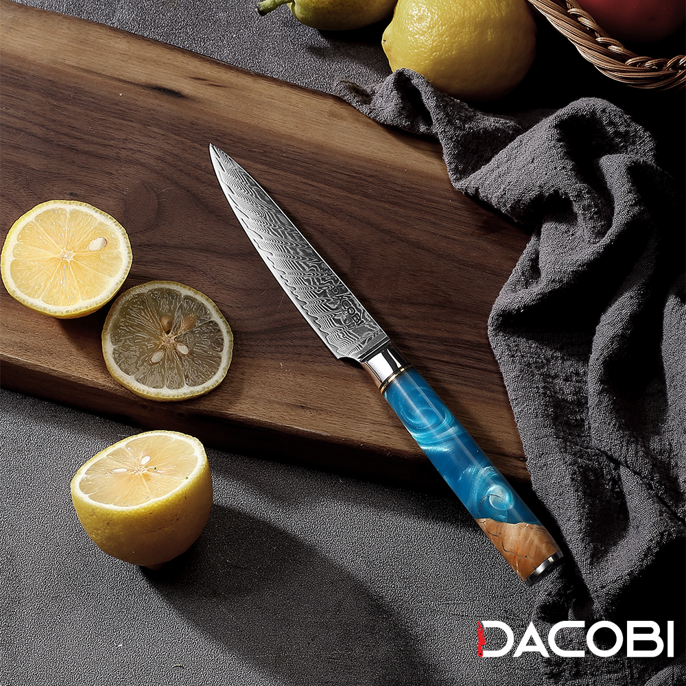 DACOBI C5 je univerzalni nož koji spaja svestranost i dizajn. Kovan je od Damask čelika koji je poznat po svojoj izdržljivosti, oštrini i prepoznatljivom uzorku. Oštrica ima zakrivljeni rub koji s lakoćom podnosi bilo koju hranu. Drška je izrađena od plave smole i tvrdog drveta, što stvara nevjerojatan i udoban zahvat. C5 je profesionalni univerzalni nož koji će vas oduševiti svojom kvalitetom i stilom. Ne propustite ovu priliku da posjedujete DACOBI nož koji je prilagodljiv koliko i prekrasan.